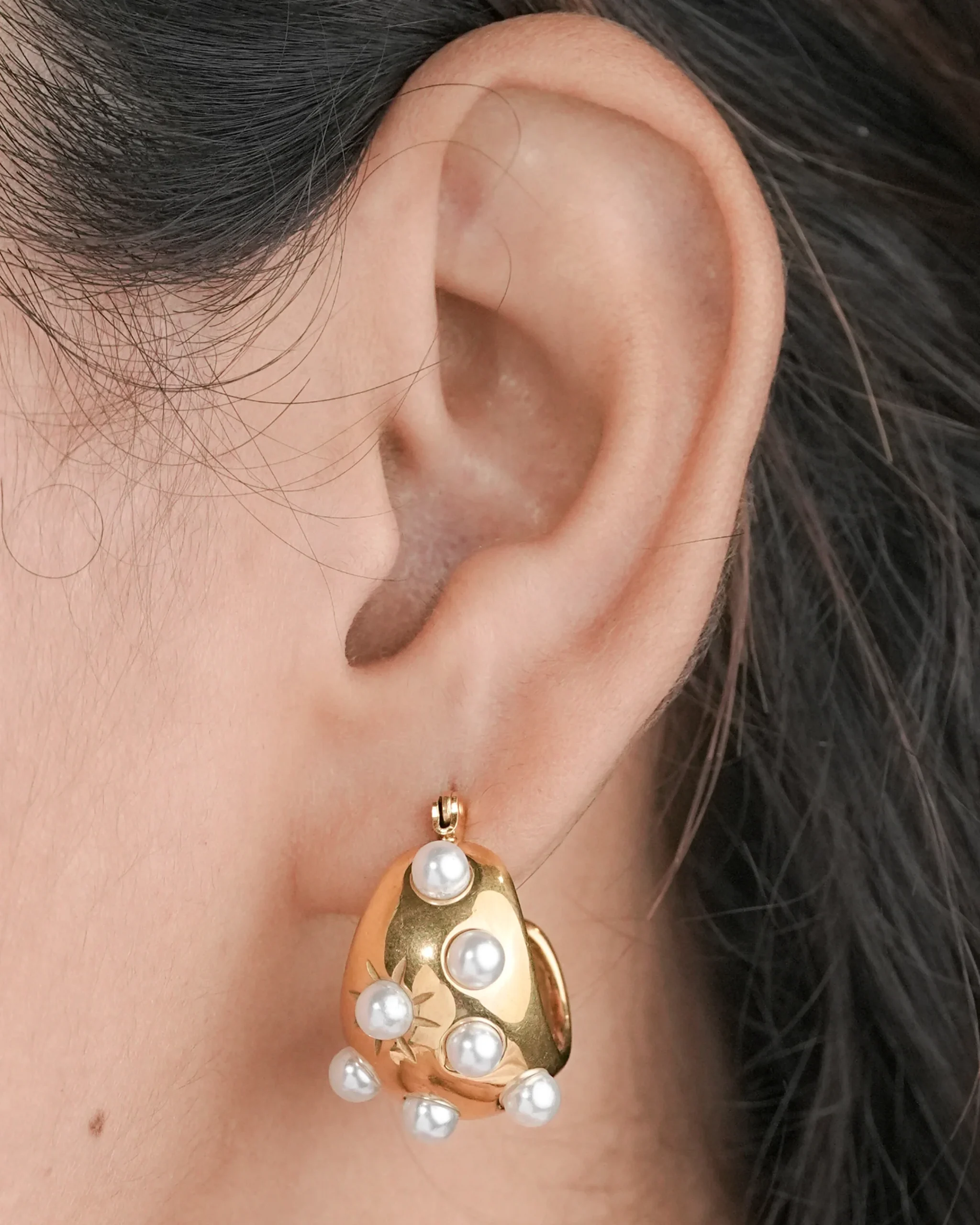 The “Pearl Blossom” Golden Hoops If you love jewelry that stands out, these are for you! Instead of a plain gold hoop, these earrings give you a 3D look with beautiful white pearls “popping” out of the golden surface. They are the perfect accessory for weddings, parties, or even a fancy lunch date.