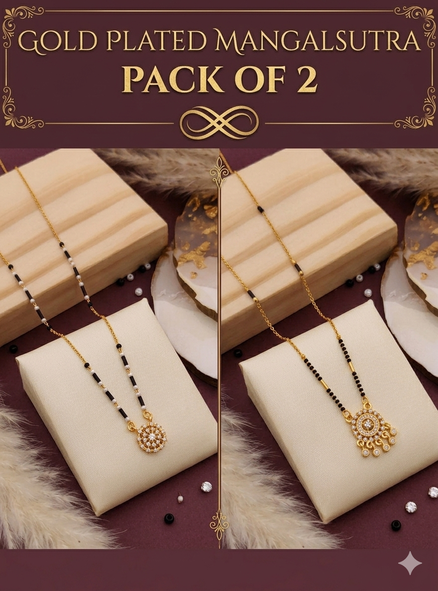 Upgrade your jewelry collection with this elegant Pack of 2 Gold Plated Mangalsutra Set, designed for modern women who love a blend of tradition and style. These beautifully crafted mangalsutras feature classic black beads with stunning gold-plated pendants, perfect for both daily wear and special occasions.