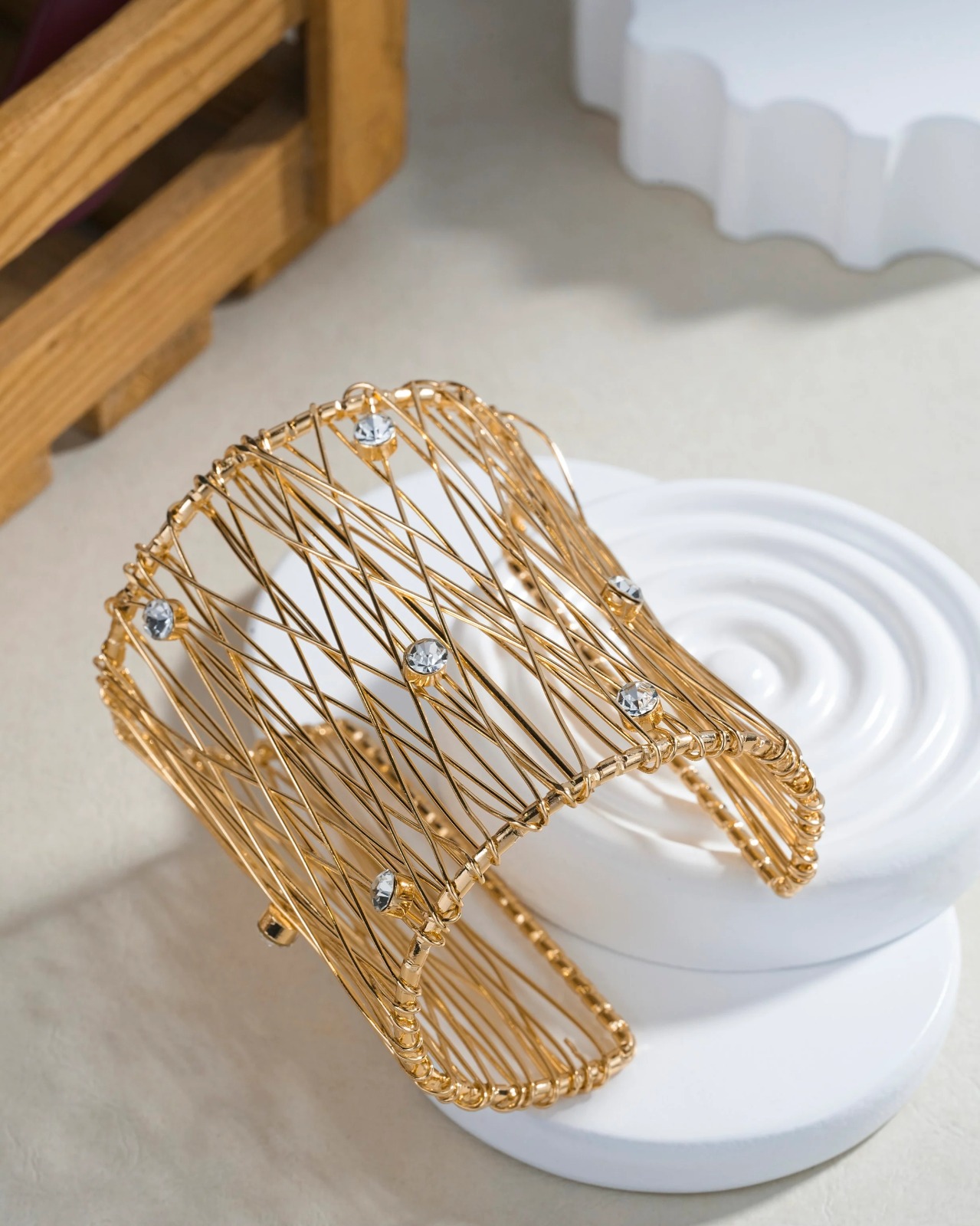 Crafted with a sophisticated “nest” of gold-tone metallic threads, this bracelet features an intricate, open-work lattice design. The overlapping wires create a beautiful play of light and shadow against the skin, offering a breathable, lightweight feel despite its bold silhouette.