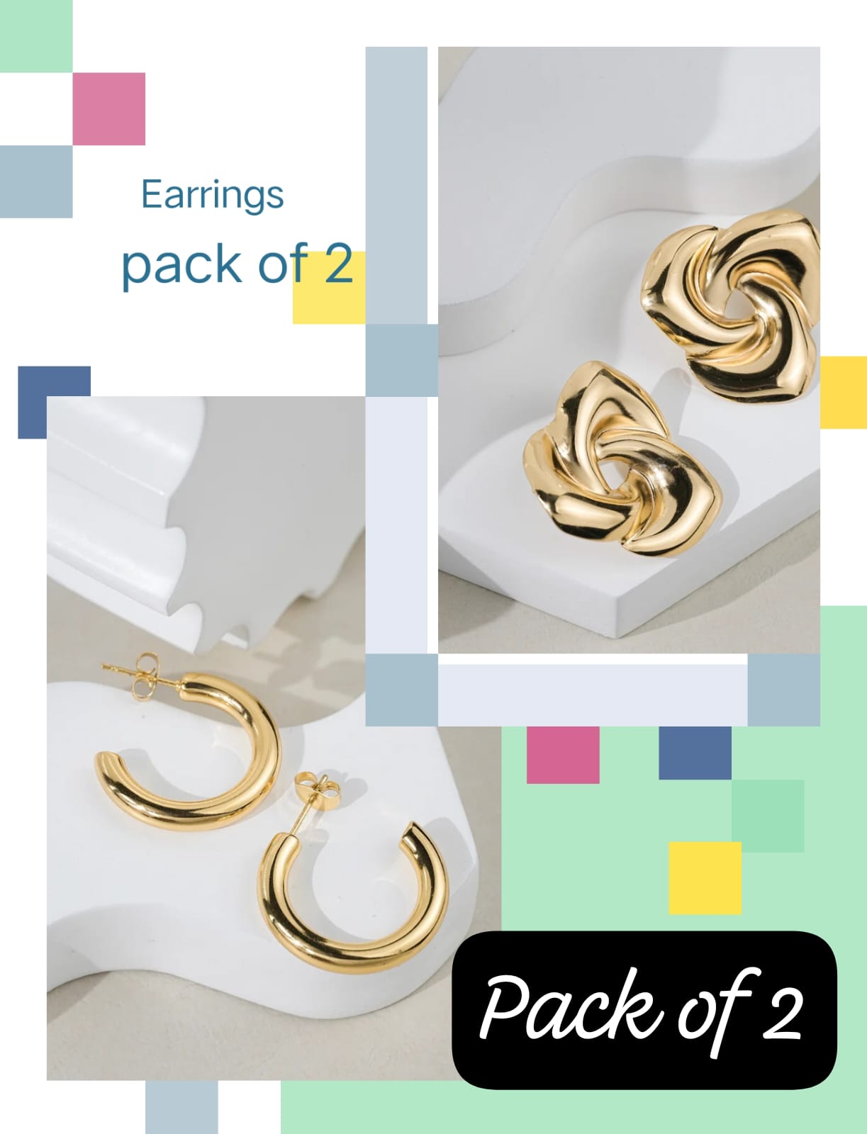 Upgrade your jewelry collection with this perfect 2-in-1 combo. This set features two of the most popular golden earring styles—one bold and artistic, and one classic and smooth. Whether you are going to the office or a party, this pack has the right pair for you.