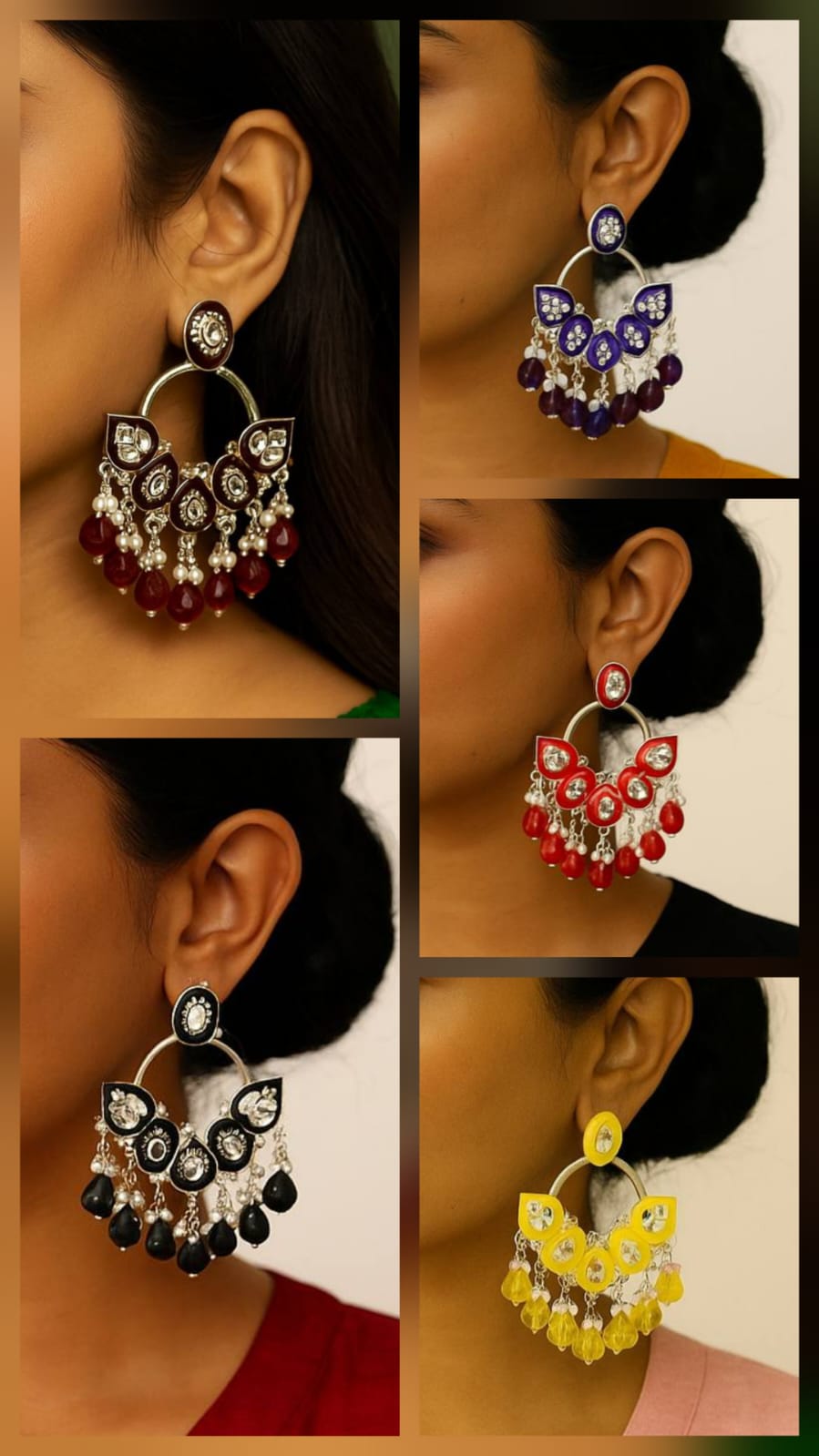 • Elevate your ethnic wardrobe with this stunning Pack of 5 Chandbali earrings. This curated set offers a spectrum of colors, ensuring you have the perfect match for every outfit. Combining the timeless elegance of Kundan-style stonework with the intricate artistry of Meenakari (enamel) work, these earrings are a celebration of traditional Indian craftsmanship.