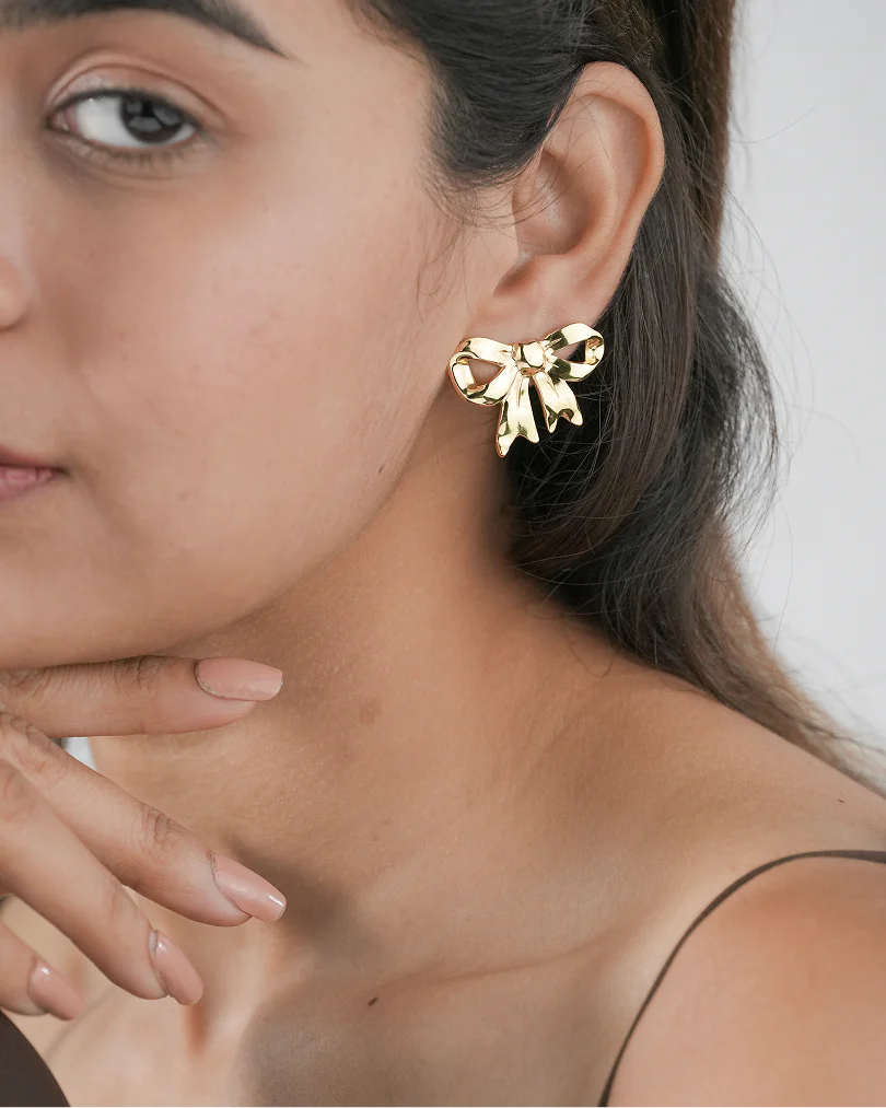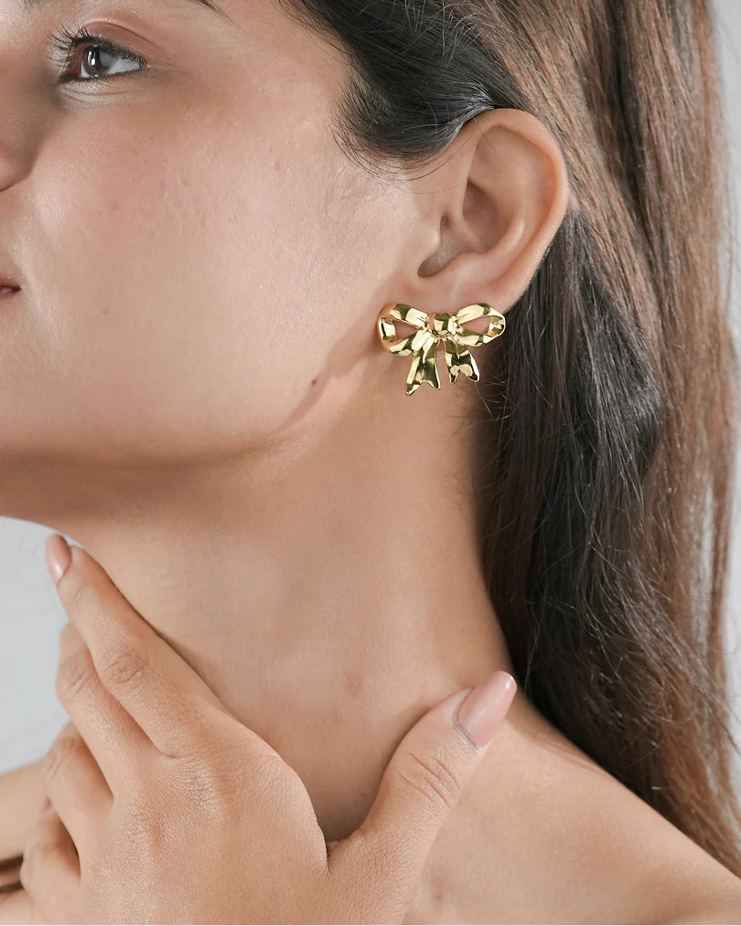 Pair 1: Golden Ribbon Bows. These studs feature a smooth, shiny finish in a classic bow shape. Perfect for adding a feminine touch to any outfit.