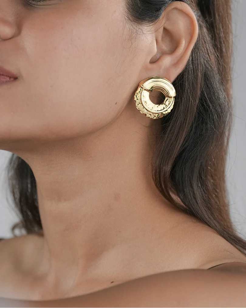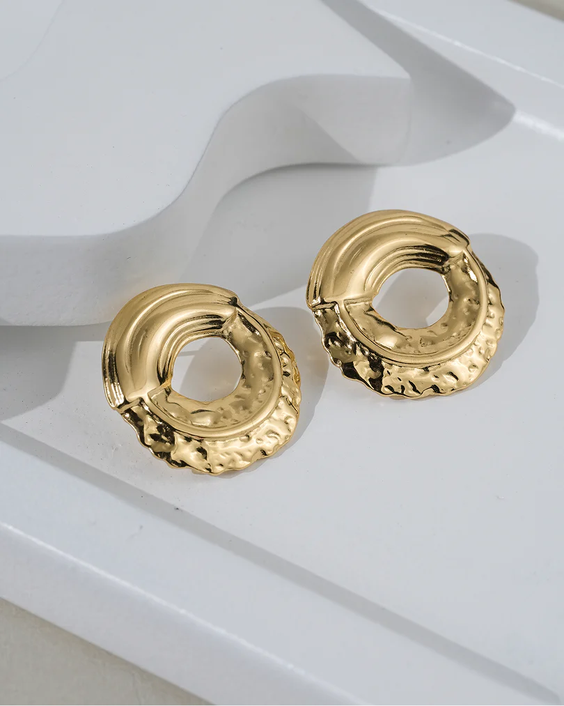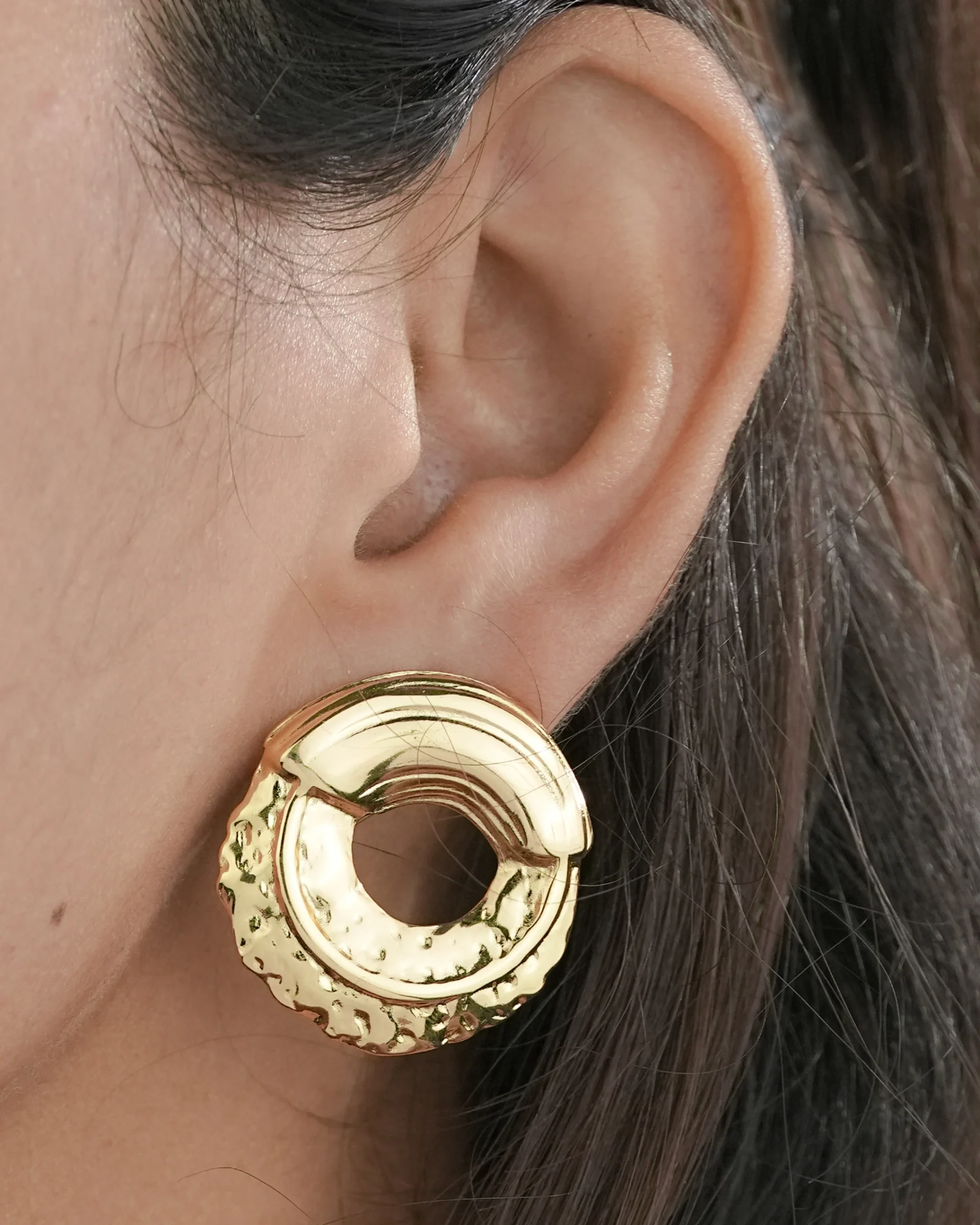 Pair 2: Textured Golden Circles. These modern hoops have a unique “hammered” effect on the bottom half, making them stand out and catch the light beautifully.