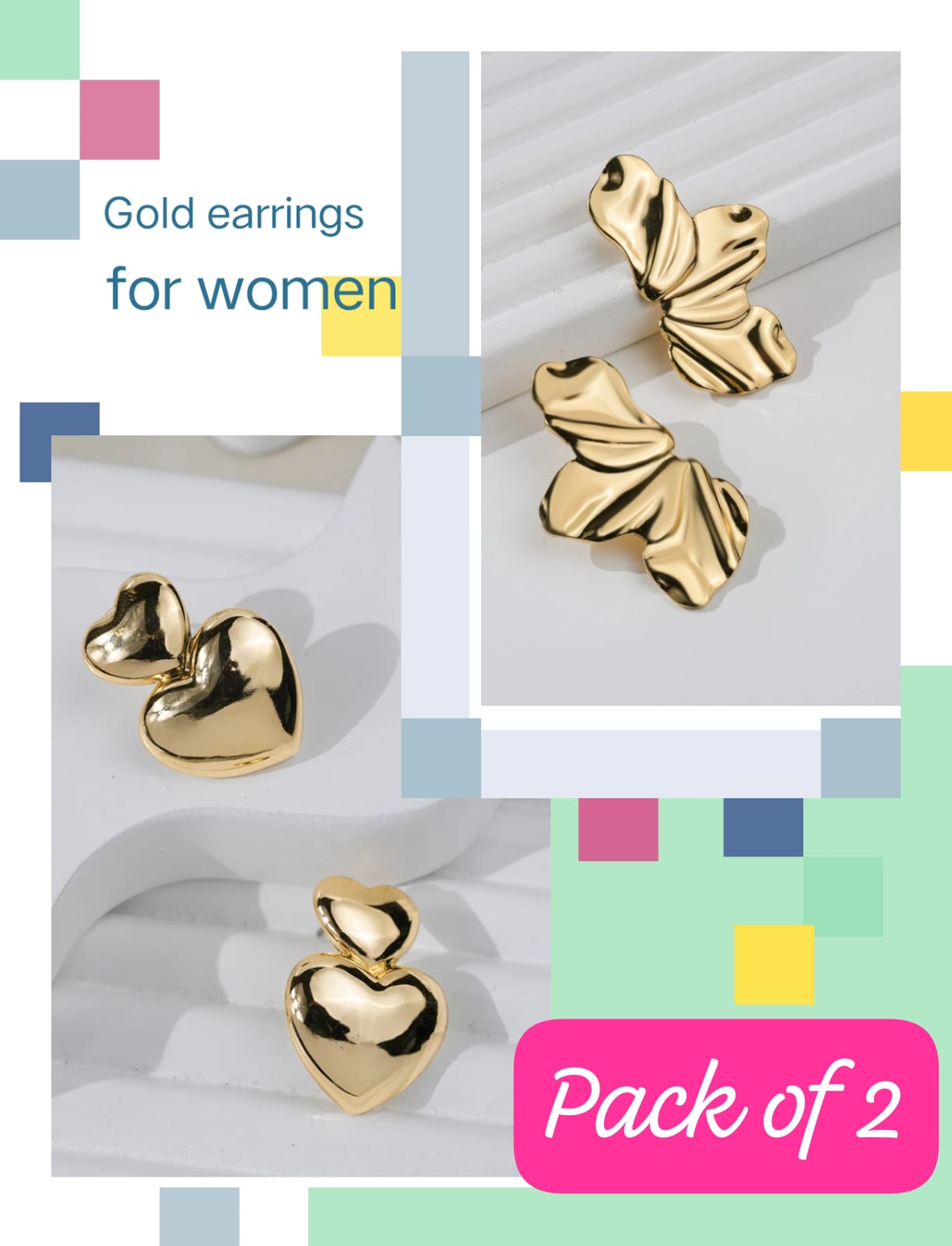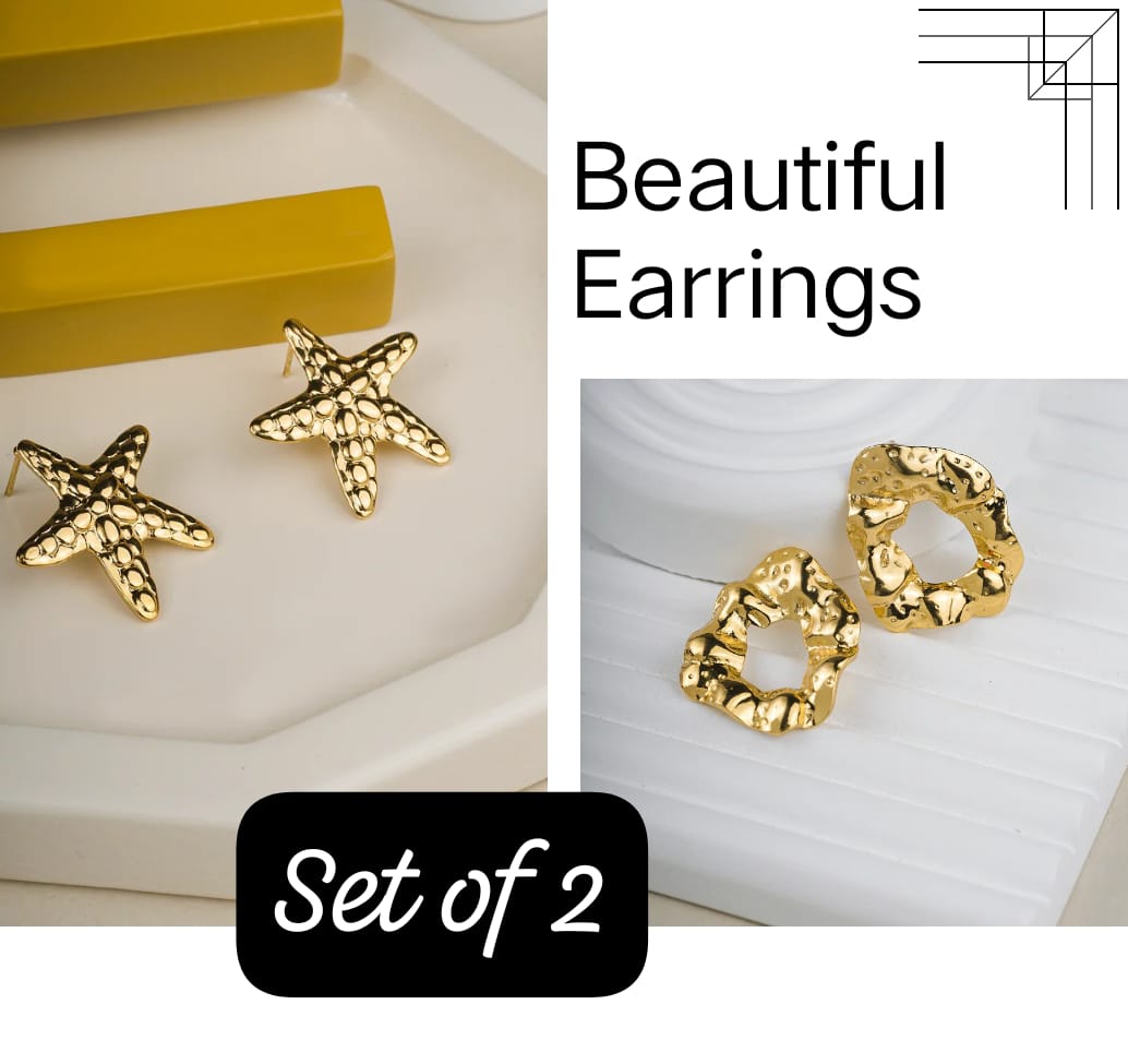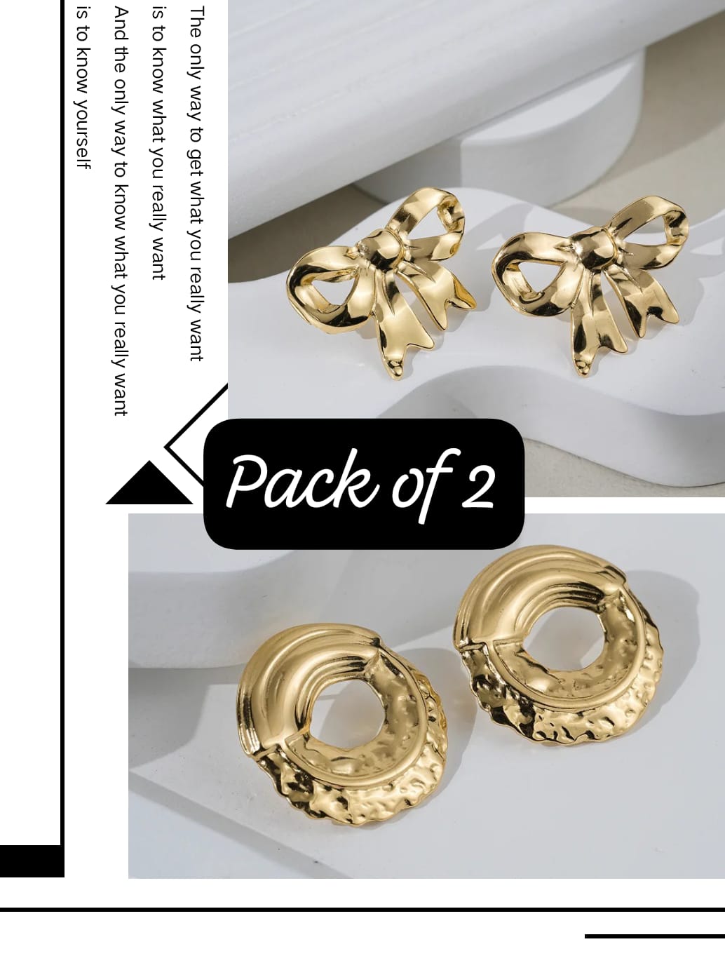 This pack of 2 offers a mix of “Pretty & Powerful” styles. It includes one pair of shiny golden ribbon bow studs for a sweet look, and one pair of bold, round hoops with a unique hammered texture for a modern feel.
